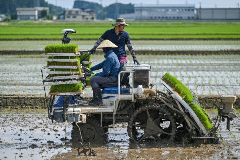 Farmers use a transplanter to plant rice seedlings at a farm in the town of Sanjo, Niigata prefecture in northern Japan. (Photo: AFP)